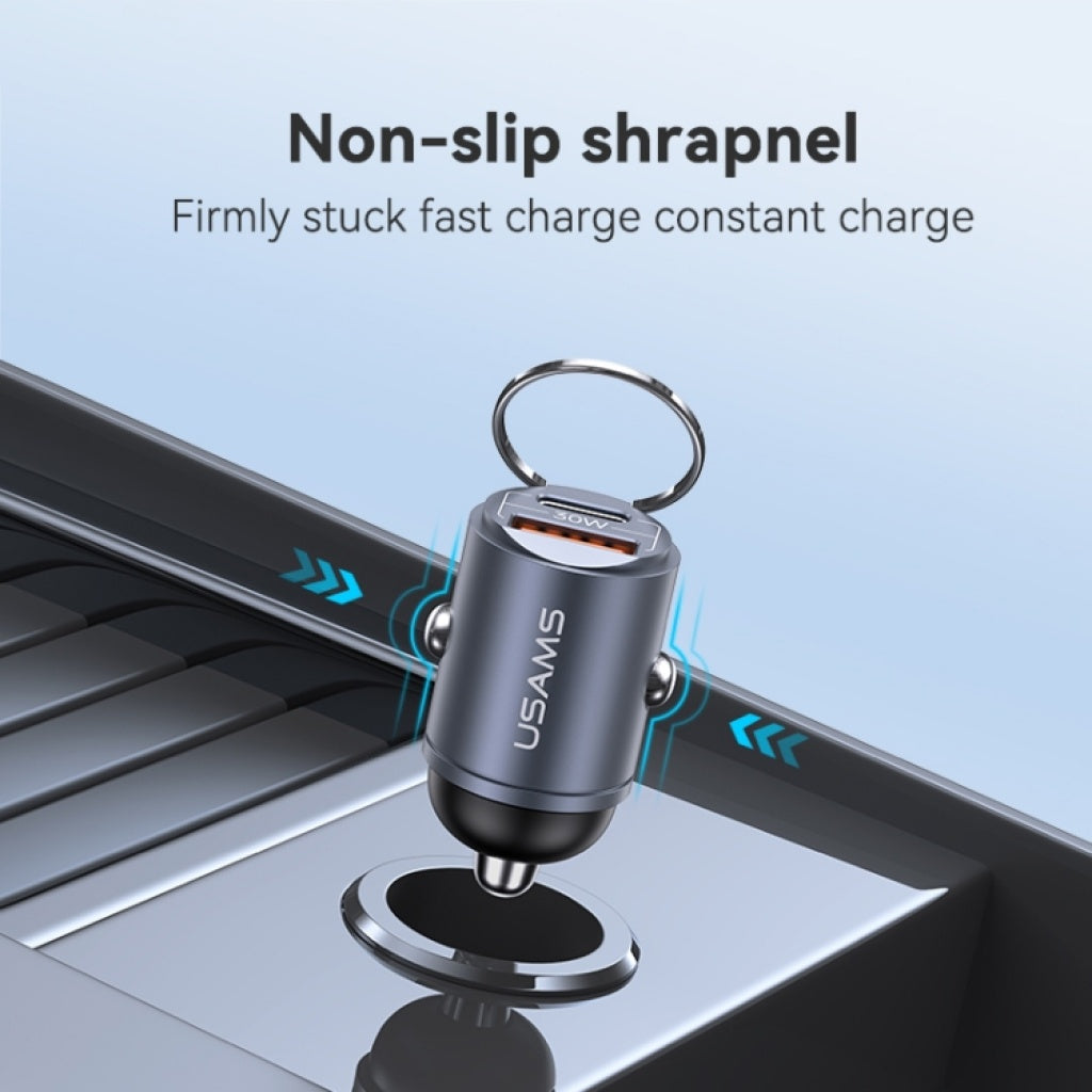 Mantén tus dispositivos siempre cargados mientras conduces con el Cargador Auto USAMS C38 de 30W.